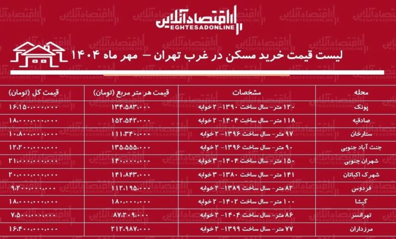 لیست قیمت خرید مسکن در غرب تهران / خرید خانه در کدام محله‌ها به بودجه کمتری نیاز دارد؟ + جدول مهر ماه ۱۴۰۴