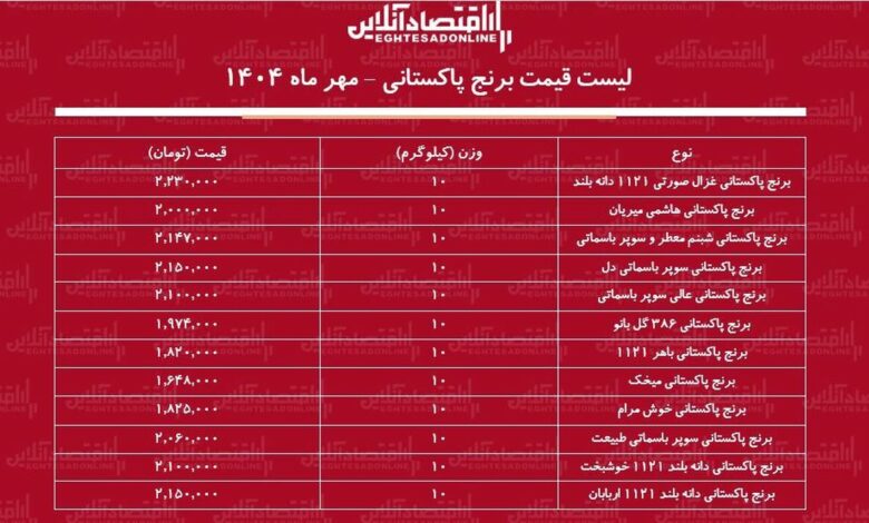 قیمت جدید برنج پاکستانی ۲۸ مهر ماه ۱۴۰۴ / کیسه ۱۰ کیلویی برنج پاکستانی سوپر باسماتی چند شد؟ + جدول