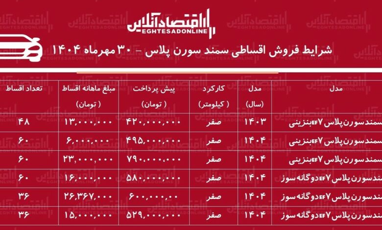به گزارش سرویس خودرو اقتصادآنلاین، براساس آگهی های منتشر شده از فروش اقساطی سورن پلاس در نمایشگاه های شخصی خودرو، سمند سورن پلاس EF7 بنزینی مدل ۱۴۰۳ با پیشپرداخت ۴۲۰ میلیون تومان و اقساط ۱۳ میلیون تومانی در ۴۸ قسط عرضه میشود؛ مدلی که همچنان به عنوان یکی از پرفروشترین نسخههای سورن شناخته میشود.