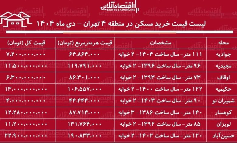 لیست قیمت خرید مسکن در منطقه ۴ تهران / خرید آپارتمان ۲ خوابه در لویزان، مجیدیه، حکیمیه و…چقدر هزینه دارد؟ + جدول دی ماه ۱۴۰۴
