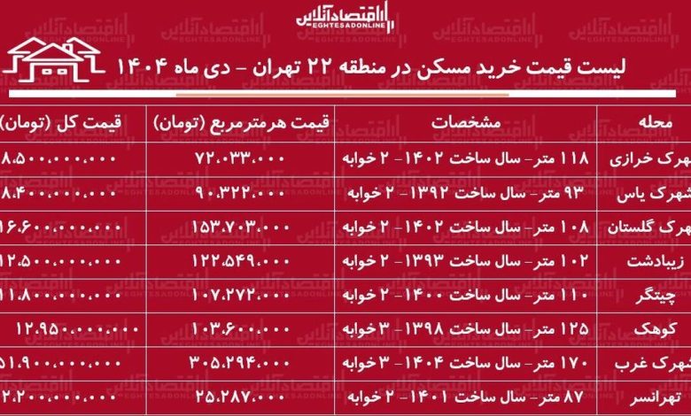 لیست قیمت خرید مسکن در منطقه ۲۲ تهران / قیمت خرید هر متر آپارتمان در شهرک غرب، چیتگر و….چند شد؟ + جدول دی ماه ۱۴۰۴