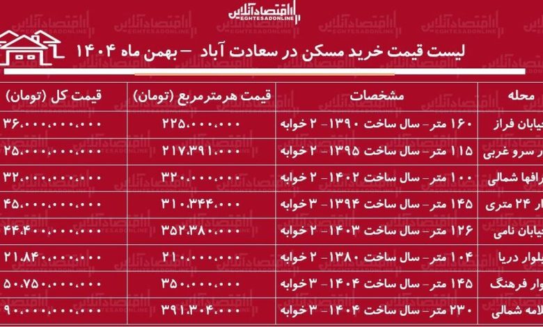 لیست قیمت خرید مسکن در سعادتآباد / قیمت یک آپارتمان ۱۰۰ متری در این منطقه چقدر است؟ + جدول بهمن ماه ۱۴۰۴
