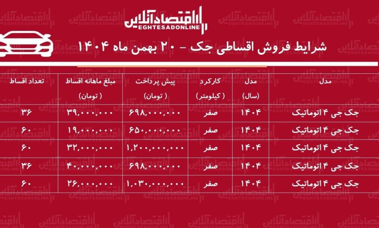 به گزارش سرویس خودرو اقتصادآنلاین، بر اساس آگهیهای فروش اقساطی جک در نمایشگاههای شخصی خودرو، جک J۴ اتوماتیک با پیشپرداخت ۶۹۸ میلیون تومان و اقساط ماهانه ۳۹ میلیون تومان در قالب ۳۶ قسط عرضه شده است.
