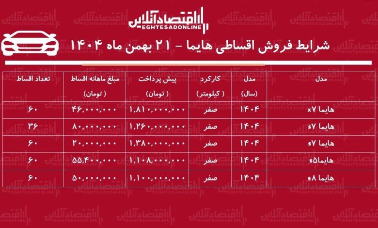 شرایط جدید فروش اقساطی هایما بهمن‌ماه ۱۴۰۴ / با ماهی ۲۰ میلیون تومان شاسی بلند بخرید + جدول