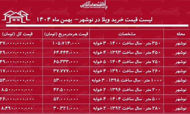 لیست قیمت خرید ویلا در نوشهر / میانگین قیمت هر متر ویلا در این منطقه چقدر است؟ + جدول بهمن ماه ۱۴۰۴