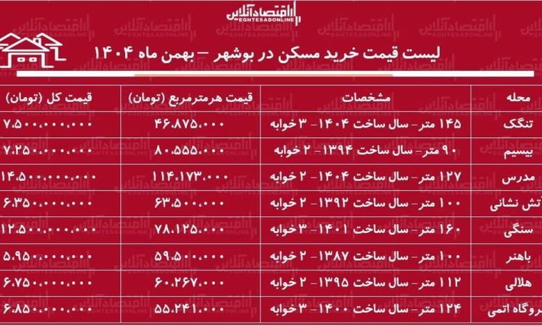 لیست قیمت خرید مسکن در بوشهر / قیمت یک آپارتمان ۲ خوابه در این منطقه چقدر است؟ + جدول بهمن ماه ۱۴۰۴