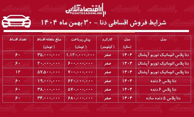 شرایط جدید فروش اقساطی دنا بهمن ۱۴۰۴ / با ۶۰۰ میلیون تومان دنا اتوماتیک بخرید! + جدول