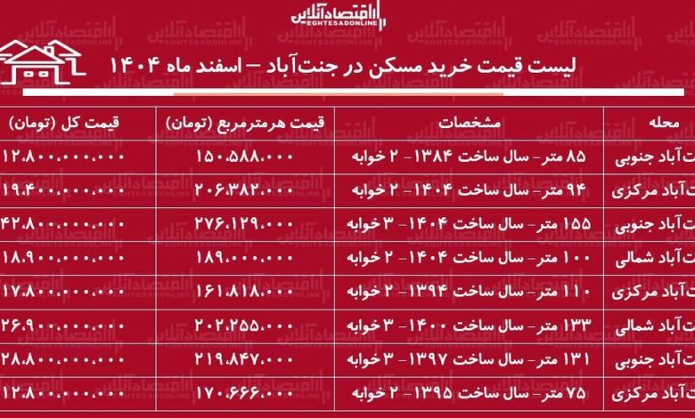 لیست قیمت خرید مسکن در جنتآباد / قیمت هر متر آپارتمان در این منطقه چقدر است؟ + جدول اسفند ماه ۱۴۰۴