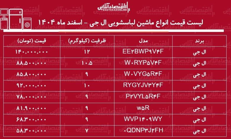 لیست قیمت انواع ماشین لباسشویی ال جی در بازار / ماشین لباسشویی ۹، ۱۰ و۱۲ کیلویی ال جی چند شد؟ + جدول اسفند ماه ۱۴۰۴
