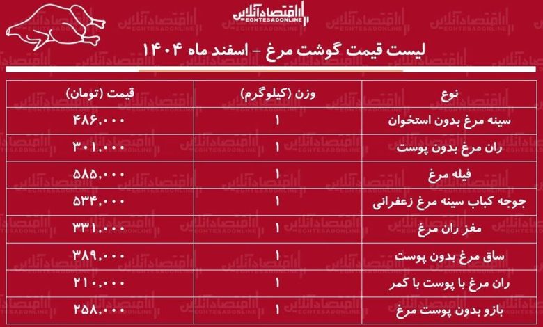 لیست قیمت گوشت مرغ امروز ۸ اسفند ۱۴۰۴ / فیله مرغ کیلویی چند شد؟ + جدول