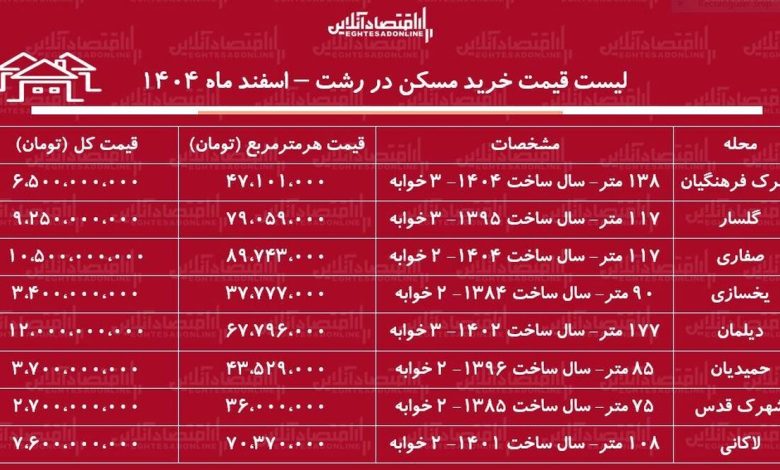 لیست قیمت خرید مسکن در رشت / قیمت یک آپارتمان ۲ خوابه در محلات مختلف رشت چقدر است؟ + جدول اسفند ماه ۱۴۰۴