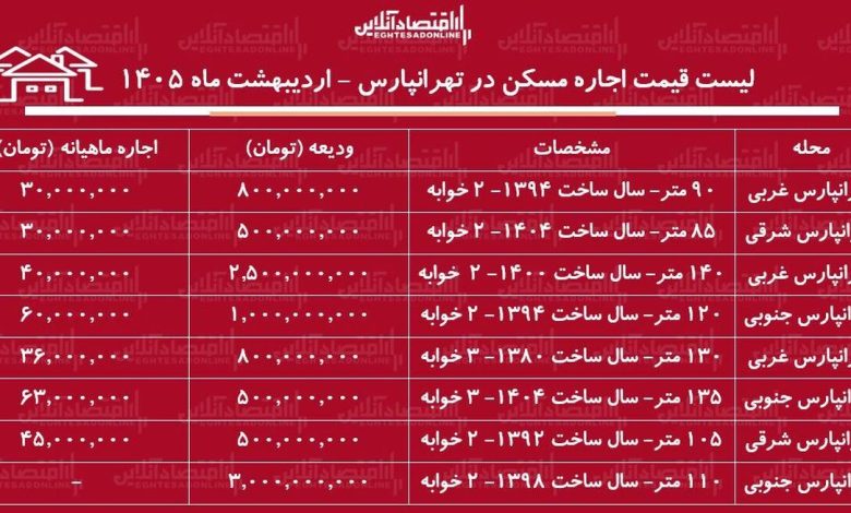 لیست قیمت اجاره مسکن در تهرانپارس / اجاره آپارتمان ۲ خوابه در این منطقه چقدر سرمایه نیاز دارد؟ + جدول اردیبهشت ماه ۱۴۰۵