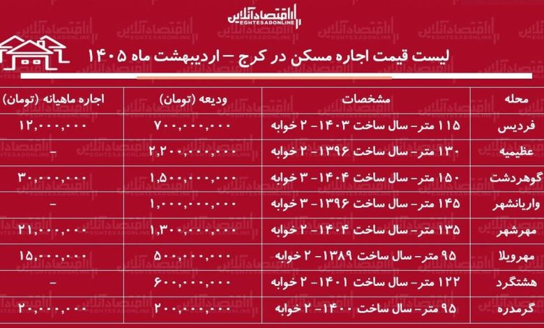 لیست قیمت اجاره مسکن در کرج / رهن و اجاره آپارتمان ۲ خوابه در این منطقه چقدر است؟ + جدول اردیبهشت ماه ۱۴۰۵