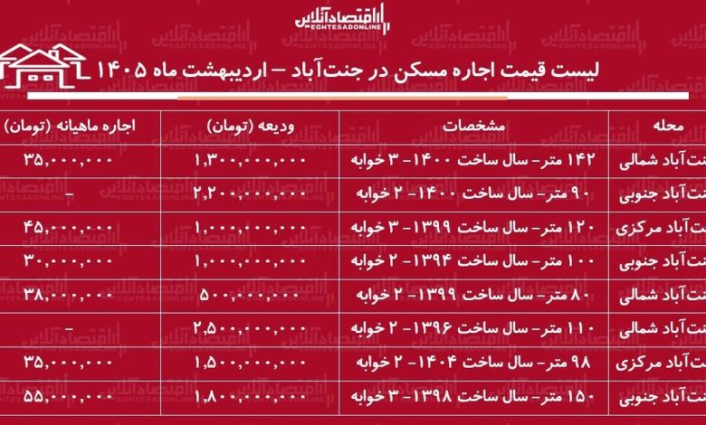 لیست قیمت اجاره مسکن در جنتآباد / رهن و اجاره آپارتمان ۲ خوابه در این منطقه چقدر است؟ + جدول اردیبهشت ماه ۱۴۰۵