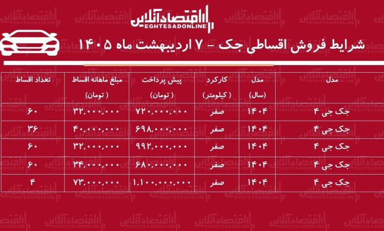 شرایط جدید فروش اقساطی جک در بازار اردیبهشت‌ماه ۱۴۰۵ / با ۶۹۸ میلیون تومان جک صفر بخرید + جدول
