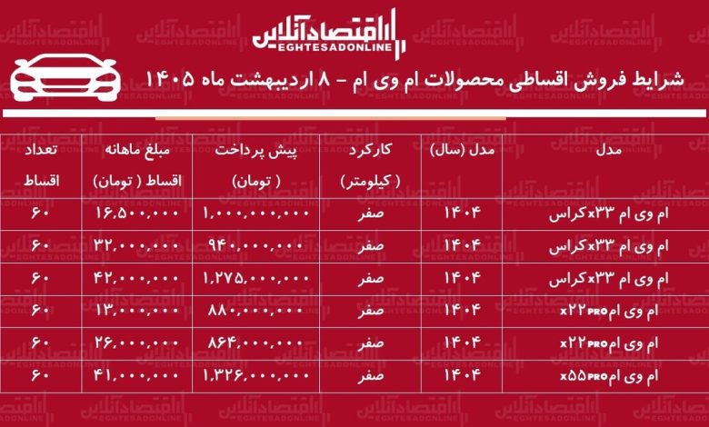 شرایط جدید فروش اقساطی محصولات ام وی ام در بازار / با اقساط ۵ ساله خودرو اتوماتیک بخرید + جدول اردیبهشت ۱۴۰۵