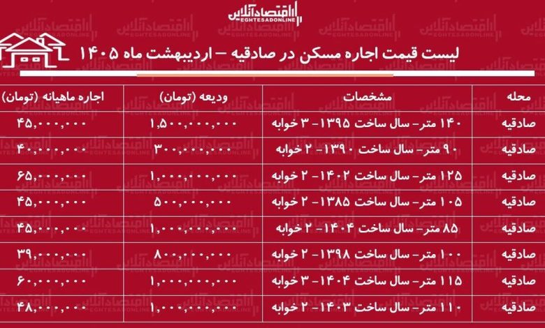 لیست قیمت اجاره مسکن در صادقیه / هزینه رهن و اجاره آپارتمان ۲ خوابه در این منطقه چقدر است؟ + جدول اردیبهشت ماه ۱۴۰۵