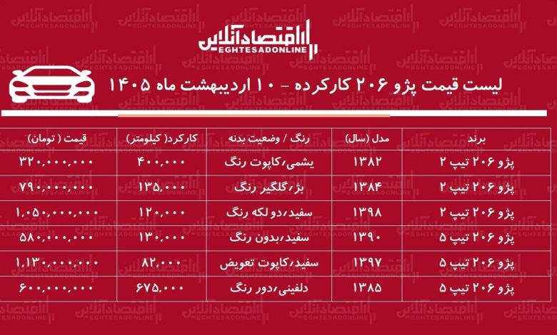 به گزارش سرویس خودرو اقتصادآنلاین، بر اساس آگهیهای پژو ۲۰۶ کارکرده، قیمت پژو ۲۰۶ تیپ ۲ سال ۱۳۸۲ با کارکرد ۴۰۰ هزار کیلومتر و کاپوت رنگ، در محدوده ۳۲۰ میلیون تومان قرار دارد.
